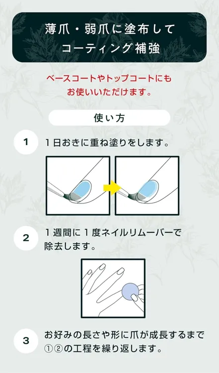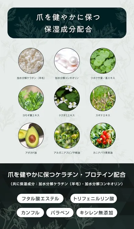 | 全成分 | 酢酸ブチル、酢酸エチル、ニトロセルロース、イソプロパノール、安息香酸スクロース、エタノール、クエン酸アセチルトリブチル、アルキッド-2、オキシベンソン-3、水、BG、アボカド油、アルガスピノサ核油、カニナバラ果実油、加水分解ケラチン(羊毛)、(クルイベロミセス/乳酸桿菌/乳酸球菌/レウコノストック/サッカロミセス)/乳発酵液(牛乳)、加水分解コンキオリン、ヨモギ葉エキス、ツボクサ葉/茎エキス、加水分解コラーゲン、スギナエキス、ドクダミエキス、フェノキシエタノール |