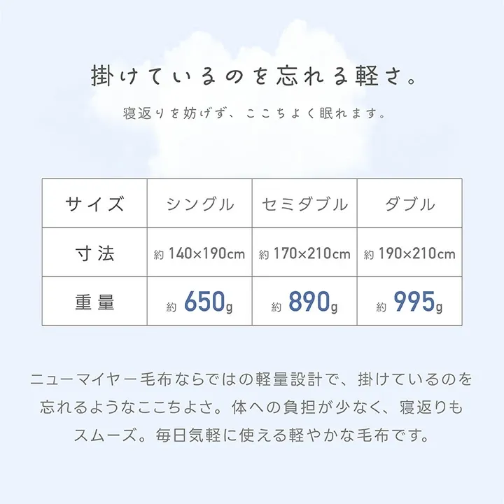 | 重さ | シングル:約650g、セミダブル:約890g、ダブル:約995g |