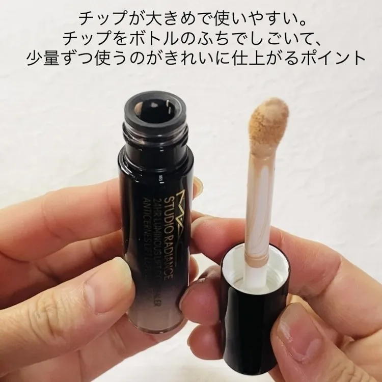 チップが大きめで使いやすい。チップをボトルのふちでしごいて、少量ずつ使うのがきれいに仕上がるポイント。重ね付けでカバーカの調整もできて、ツヤ感のある仕上がり(メイク効果による)も気に入っています。